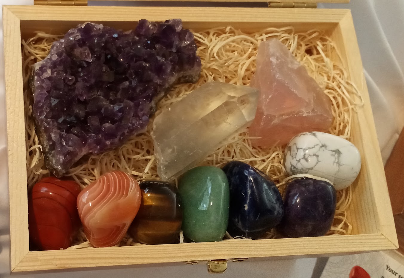 The Beginners Crystal Set is an offering of 10 crystals, each symbolically attuned to a chakra, as well as three of the most sought-after stones -- Amethyst, Quartz and Rose Quartz. Included is a chakra card and brochure, detailing the metaphysical properties of each crystal, as well as cleansing and activation instructions. The entire set arrives nestled within a rustic wooden box adorned with a sacred geometry-inspired engraving, plus a link to our complimentary 50-page EBOOK, The World of Crystals, for further exploration. Utilize the power of balancing techniques like laying the stones on the body's chakra points to promote emotional, mental and physical wellbeing.