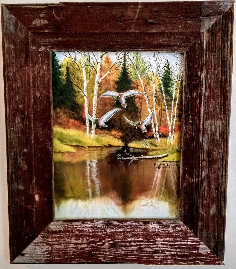 Oil creation on canvas! The frame is mastercrafted from reclaimed barnwood for a rustic feel. An amazing wildlife art piece of Mallard Ducks touchdown-ing. Signed by the artistic genius Kathie Luther. 24" x 28.5" with frame - made in 1989.