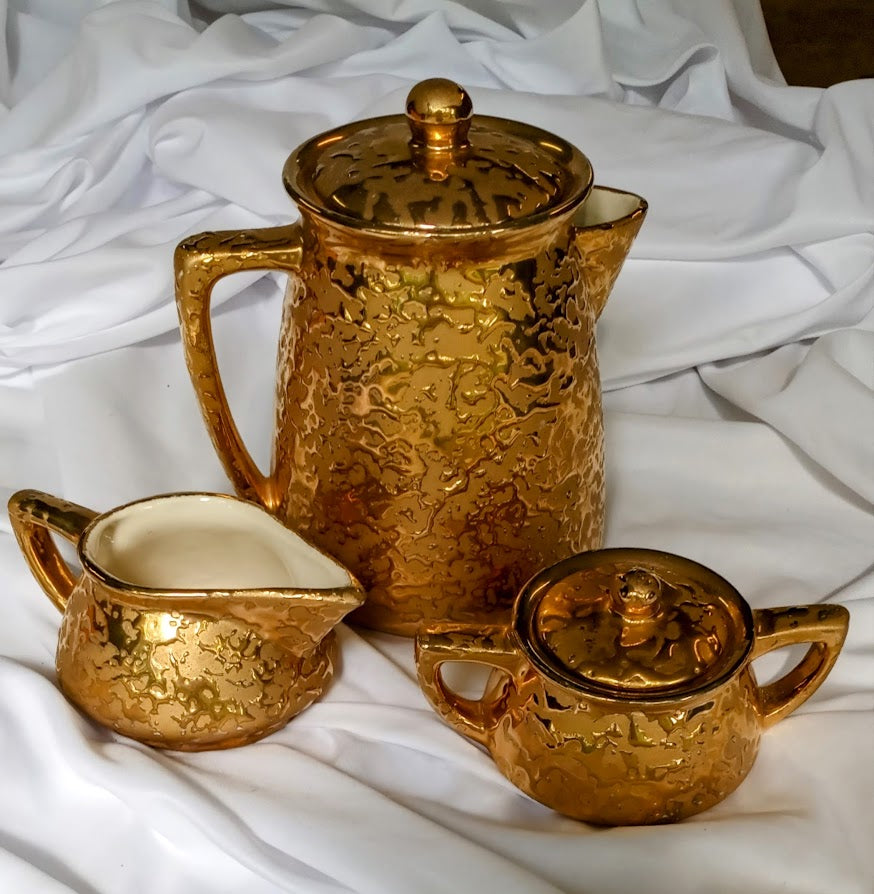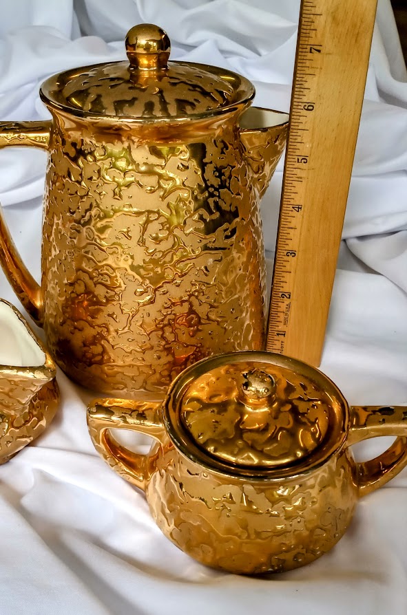 "Sunburst Gold" - A Especially Rare Gem! This sublime vintage 24K Gold Coffeepot Creamer Set is truly breathtaking. In pristine condition. Missing the cover for the sugar bowl. It is shown in the pic. It broke afterwards. Reduced $40.00.