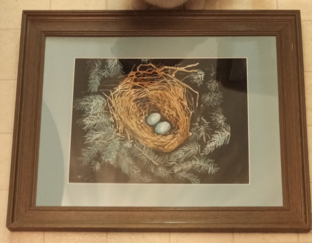 Adorn your walls with a vibrant watercolor of a robin's nest nestled in a pine tree, classicly framed n' matted. Measuring 21"x18" total, this beauty is boldly signed & dated by the one n' only Nancy Williams in '02.