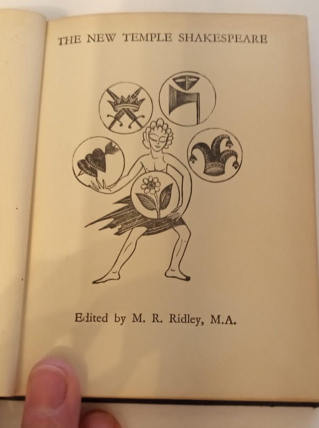 This vintage edition of The Merchant Of Venice By William Shakespeare New Temple Shakespeare - Edited by MR Ridley - Illustration by Eric Gill is in very good condition, boasting a few light scratches on the supple leather cover and secure binding, ensuring its spine is in good shape and all pages are present. Small in stature, the piece measures 4"x 5.25".