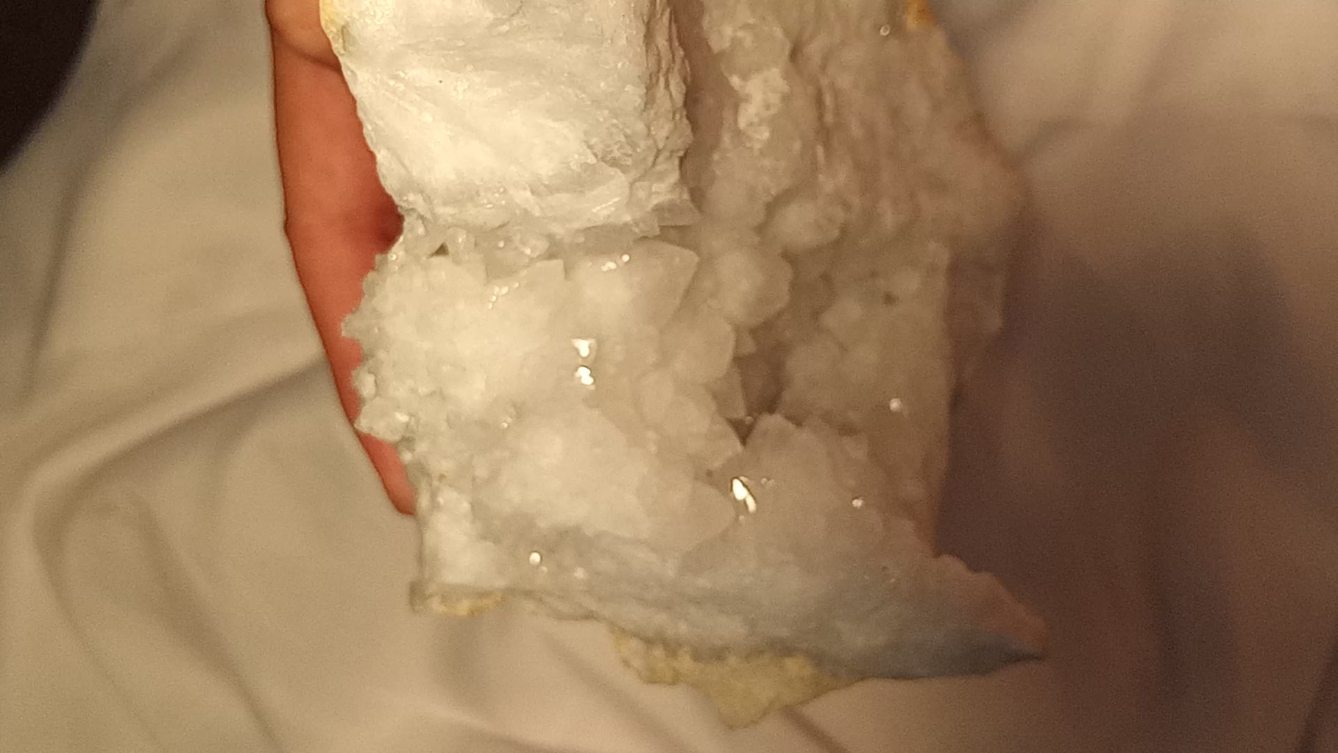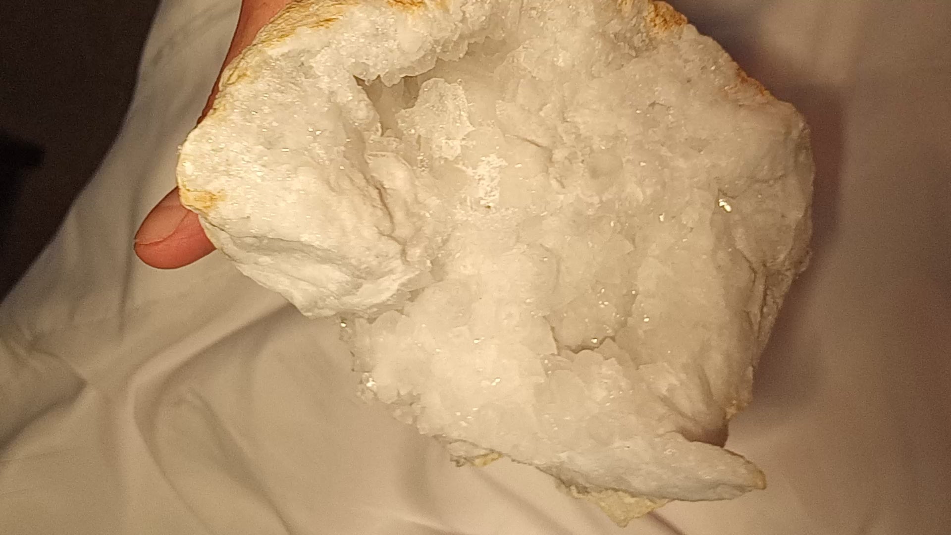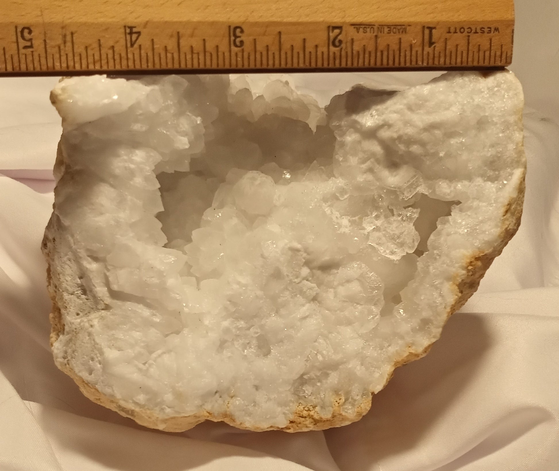 Photo is the actual geode. This geode is is approx. 5 inches wide and weighs 2.09lbs. it is approx. 5 1/4 inches high. It has natural flat spots on the bottom and back so a display stand is not needed